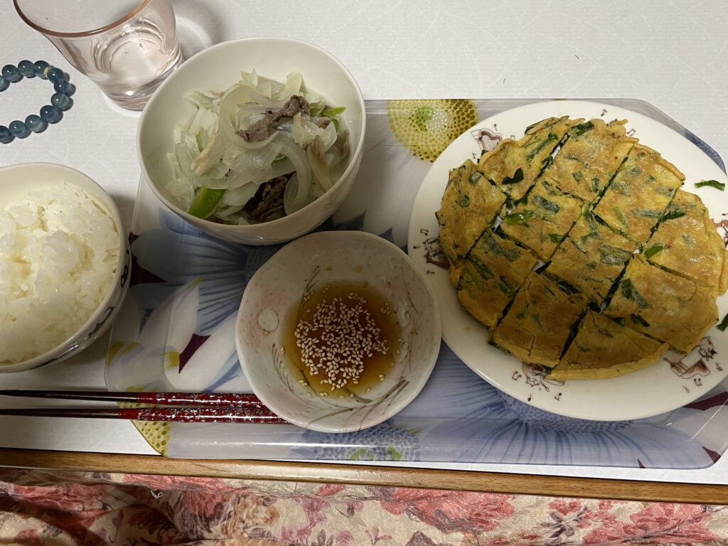 このチヂミは、ニラ、卵、米粉、鰹節。これだけ。